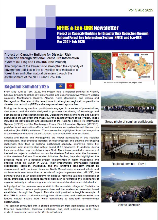 Projekti ndërtimi i kapaciteteve për Zvogëlimin e Rreziqeve nga Katastrofat përmes Sistemit Kombëtar të Informacionit për Zjarret Pyjore (NFFIS) dhe Eco-DRR, ka për qëllim të fuqizojë kapacitetet e zyrtarëve qeveritarë në parandalimin dhe zbutjen e zjarreve pyjore dhe katastrofa të tjera natyrore përmes krijimit të NFFIS dhe Eco-DRR.